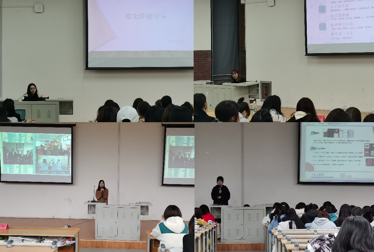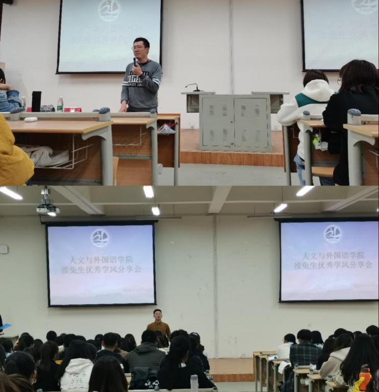 为贯彻落实学院学风建设教育工作安排,助力营造严谨积极的优良学风,进一步激发学生学习动力和兴趣,11月4日晚七点,402永利集团在主教学楼二楼东报告厅和西报告厅两个会场同时开展推免生优秀学风分享会。学院辅导员陈刚、王才升分别主持会议,推免生代表英语171班张文艺(推免攻读东南大学研究生)、日语171班吕梦辉(推免攻读国际关系学院研究生)、广告171班张文轩(推免攻读暨南大学研究生)、汉语言171班孙洋(推免攻读南京信息工程大学)担任主讲嘉宾,我院2019级、2020级全体学生参加。