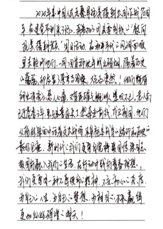 活动期间,同学们热情高涨,认真观看直播,用心聆听中共中央总书记、国家主席、中央军委主席习近平的重要讲话。习近平总书记指出,“我们要铭记抗美援朝战争的艰辛历程和伟大胜利,敢于斗争、善于斗争,知难而进、坚韧向前,把新时代中国特色社会主义伟大事业不断推向前进。”通过习近平总书记慷慨激昂的讲话,同学们共同回顾了抗美援朝战争的伟大胜利和巨大贡献,同时深刻领悟了抗美援朝战士们忠于党、忠于祖国、忠于人民的高尚情怀和不畏强敌、不怕牺牲的伟大抗美援朝精神。活动结束后,学生们纷纷书写心得体会并积极发表感言。广告201班团支书牟秀堃同学表示:“作为新时代青年,我们要以这些时代英雄为楷模,坚持理想信念,练就一身本领,在国家和人民最需要的地方绽放青春力量。”