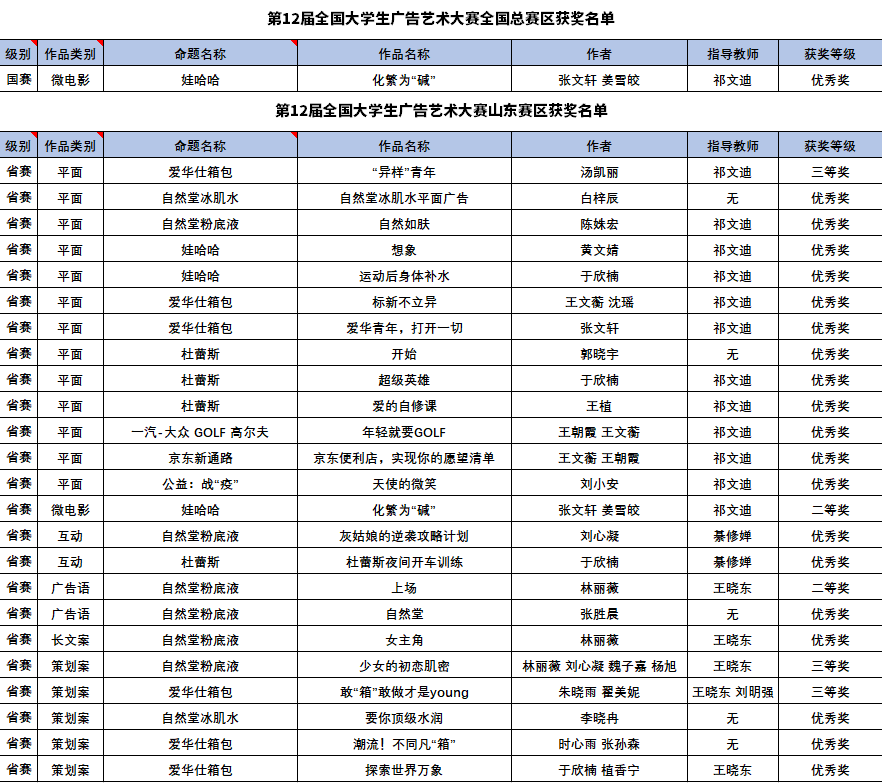 我院广告专业一直致力于将各种广告赛事作为专业教学的延展,学术理论与比赛实践相结合,培养同学们的创新精神和创造能力,在各类广告赛事中屡获佳绩。相信我院广告学子会继续勇往直前,用创意书写新的篇章!(撰稿:祁文迪、蔡文艺,审核:王晓东)