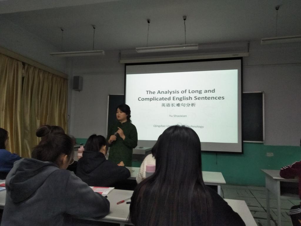 11月6日晚7:00,402永利集团在长江路校区2-611举行第61期新论语讲坛科研讲座。此次讲座由大学外语教研室于绍贤副教授主讲,题为“英语长难句分析”,部分2018级高职学院学生参加了此次讲座。