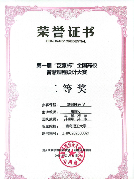 近日,由混合式教学创新者联盟与超星泛雅集团共同主办,华东师范大学、山东大学等19所高校、联盟联合主办的第一届“泛雅杯”全国高校智慧课程设计大赛在超星尔雅科技园圆满落幕。402永利集团日语专业副教授唐画女代表《基础日语IV》教学团队到现场参加全国总决赛,经过激烈角逐,荣获全国二等奖,这是我院教师在智慧教育探索道路上的重要成果,体现了学院教师在智慧教学领域具备良好的创新能力。