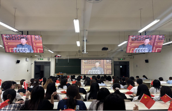 9月3日,在中国人民抗日战争暨世界反法西斯战争胜利80周年纪念日当天,学院组织学生骨干、青马学员代表齐聚一堂,集中收看阅兵式直播,认真聆听习近平总书记重要讲话。活动现场,同学们手持鲜艳的红色小国旗,脸上贴着醒目的国旗贴纸,目光坚定、神情肃穆。当看到威武的受阅队伍迈着铿锵步伐通过天安门广场时,现场多次响起热烈掌声。大家纷纷表示,将牢记历史嘱托,把爱国情、强国志、报国行融入日常学习与实践,以青春之我践行时代使命。