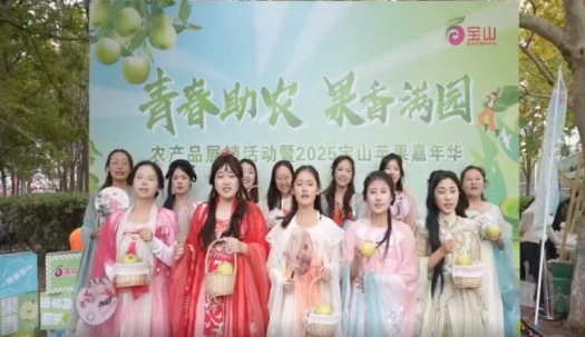 本次活动由共青团青岛西海岸新区委员会等单位共同主办,以“校地青年联动助农”为核心,搭建高校与乡村之间的合作桥梁。在特色文化展示环节,学院学子身着传统服饰,化身“十二花神”进行主题巡游,将苹果试吃装与国风美学巧妙融合,在传递助农理念的同时,也为农产品展区增添了浓厚的文化氛围。