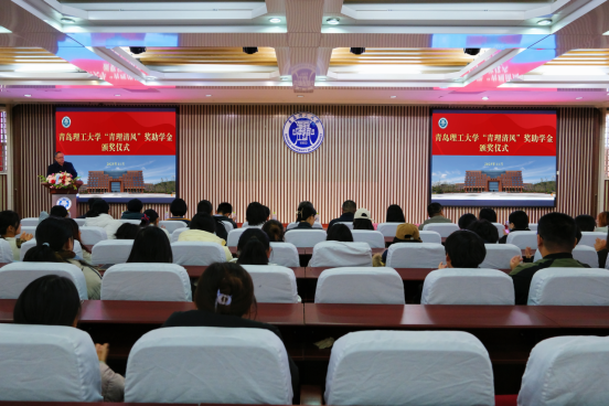 11月26日,402cc永利官网首届“青理清风”奖助学金颁发仪式在黄岛校区主教学楼一楼东报告厅举行。校纪委、学生工作处、合作发展处、校工会(妇委会)、校团委等相关部门负责同志、402永利集团领导班子成员出席仪式。“青理清风”奖助学金获得者和402永利集团网络与新媒体专业各年级学生代表100余人参加会议,市北校区学生线上参会。颁发仪式由402永利集团党委书记王粲主持。