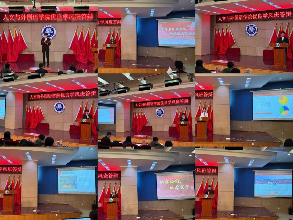 本次答辩共有11个班集体参加,各班汇报人依次上台,就思想引领、组织建设、班级定位、发展方向、特色活动、文化建设、社会实践、收获成果等八个方面对班级学风建设体系中的特色和亮点进行了详细介绍,并基于专业特点和优势,提出系列班级学风建设的创新举措。社工221班学风建设以“制度保障与文化沁润双轮驱动”为核心思路,建立“学情雷达”动态监测机制,推行“一对多”定向帮扶和兴趣小组拓展实现从“面”到“点”突破;英语232班以宿舍管理为核心,聚焦矛盾化解打造温暖港湾,由宿舍班委带头带动学习与竞赛,筑牢朋辈互助基础,以务实举措推进班级优良学风建设。经过激烈角逐,社工221班、英语232班拟推荐为学校优良学风标兵班,英语224、网新232、网新243、英语241拟推荐为优良学风班。
